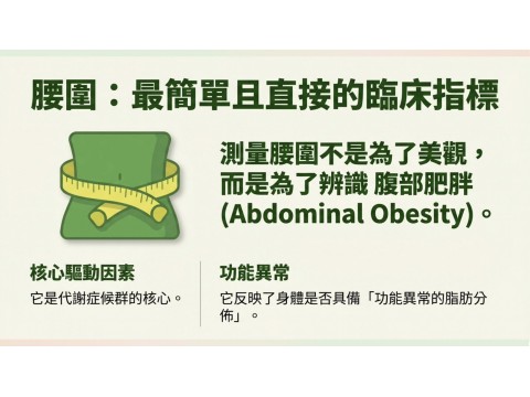 主要原因在於這是辨識腹部肥胖(Abdominal obesity)最簡單的指標,而這正是代謝症候群的核心因素。 脂肪組織,尤其是內臟脂肪(Visceral adipose tissue, VAT),會分泌促發炎因子,導致慢性發炎狀態。游離脂肪酸溢出至肝臟、肌肉等...
